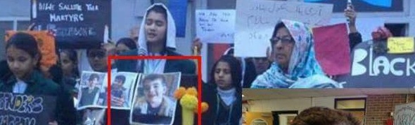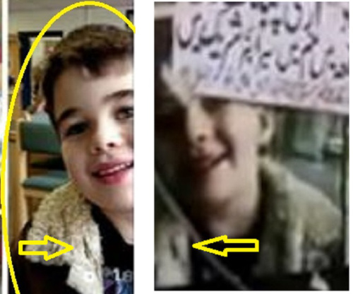 Dit slachtoffertje ‘stierf’ zowel bij de Sandy Hook schietpartij in de VS (bovenste foto’s) en ‘stierf’ een tweede keer in Pakistan als gevolg van een schietpartij door de Taliban (onderste foto’s).